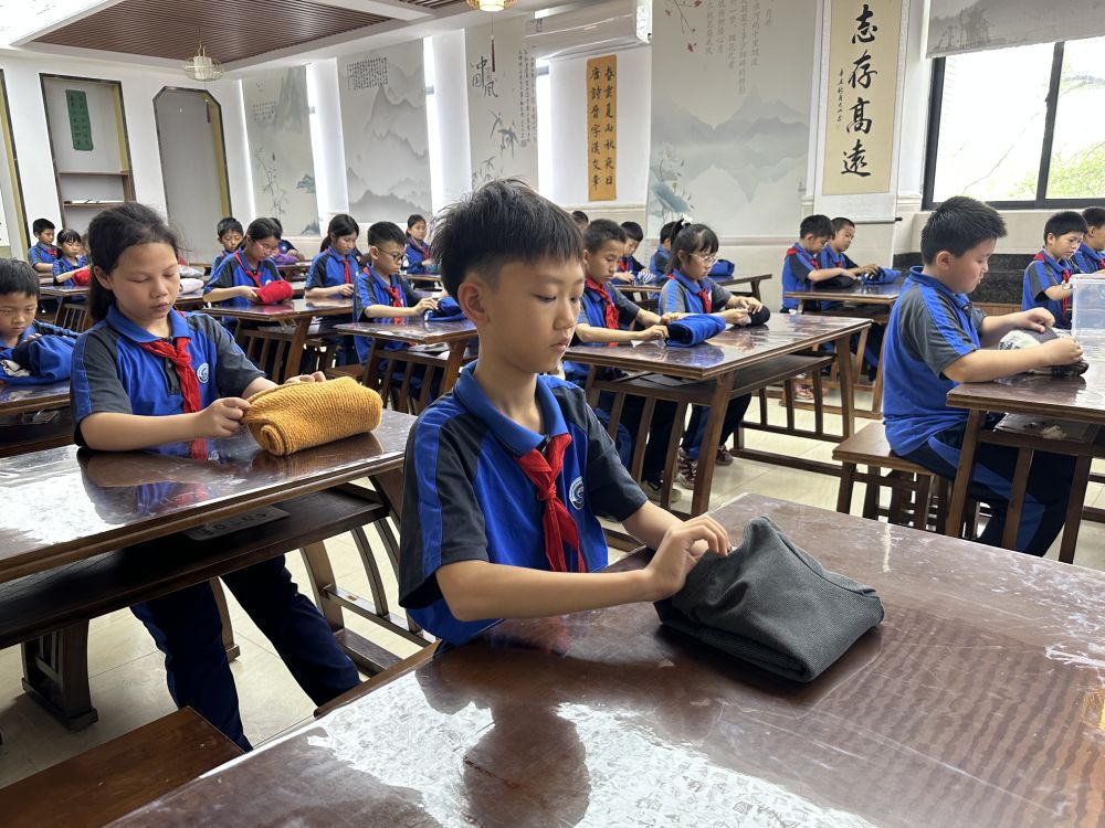 广州市增城区增江小学劳动课堂上,孩子们学习叠衣服。新华社记者杨淑馨 摄